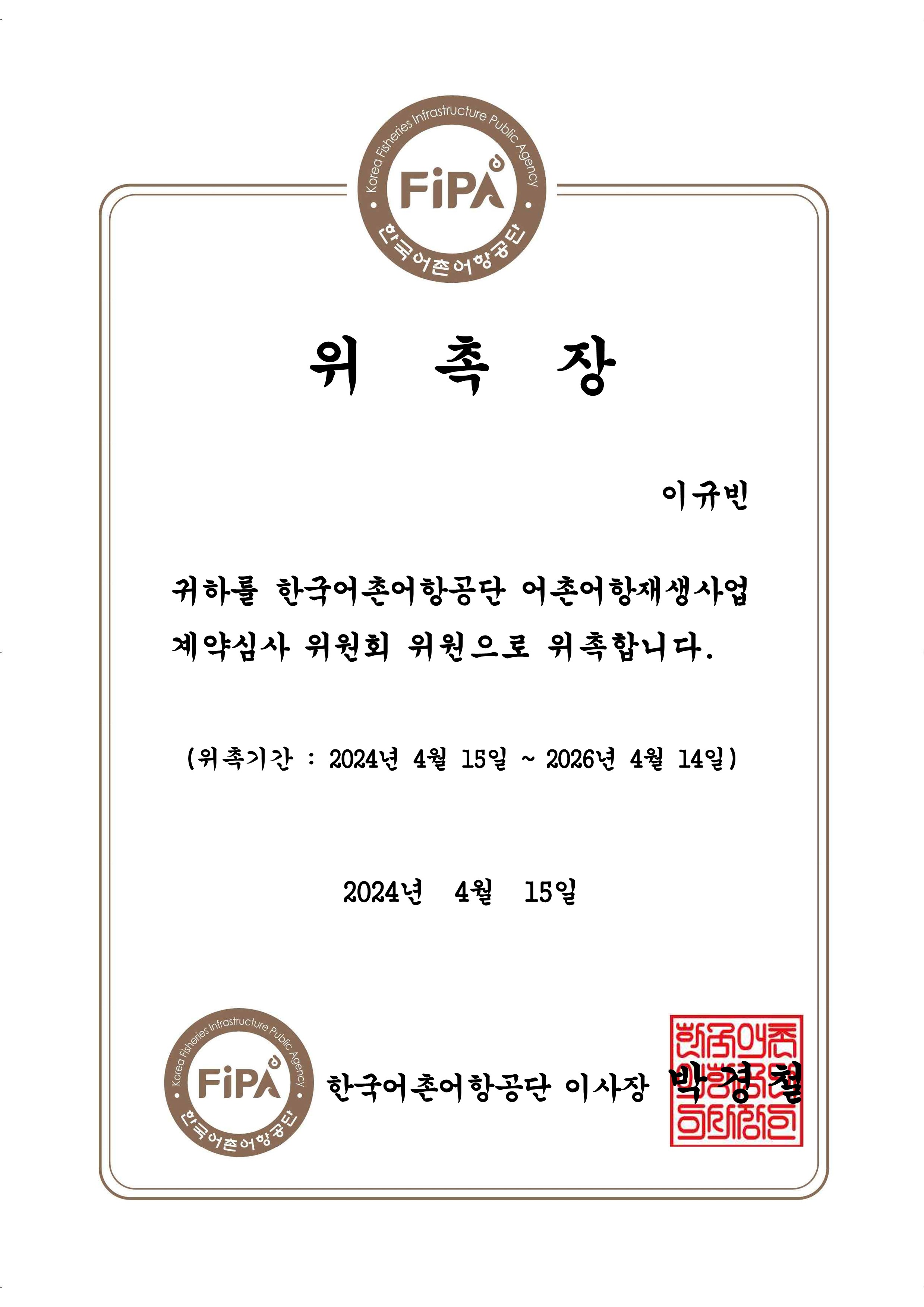 Kyubin Lee has been appointed as a committee member by Korea Fisheries Infrastructure Public Agency